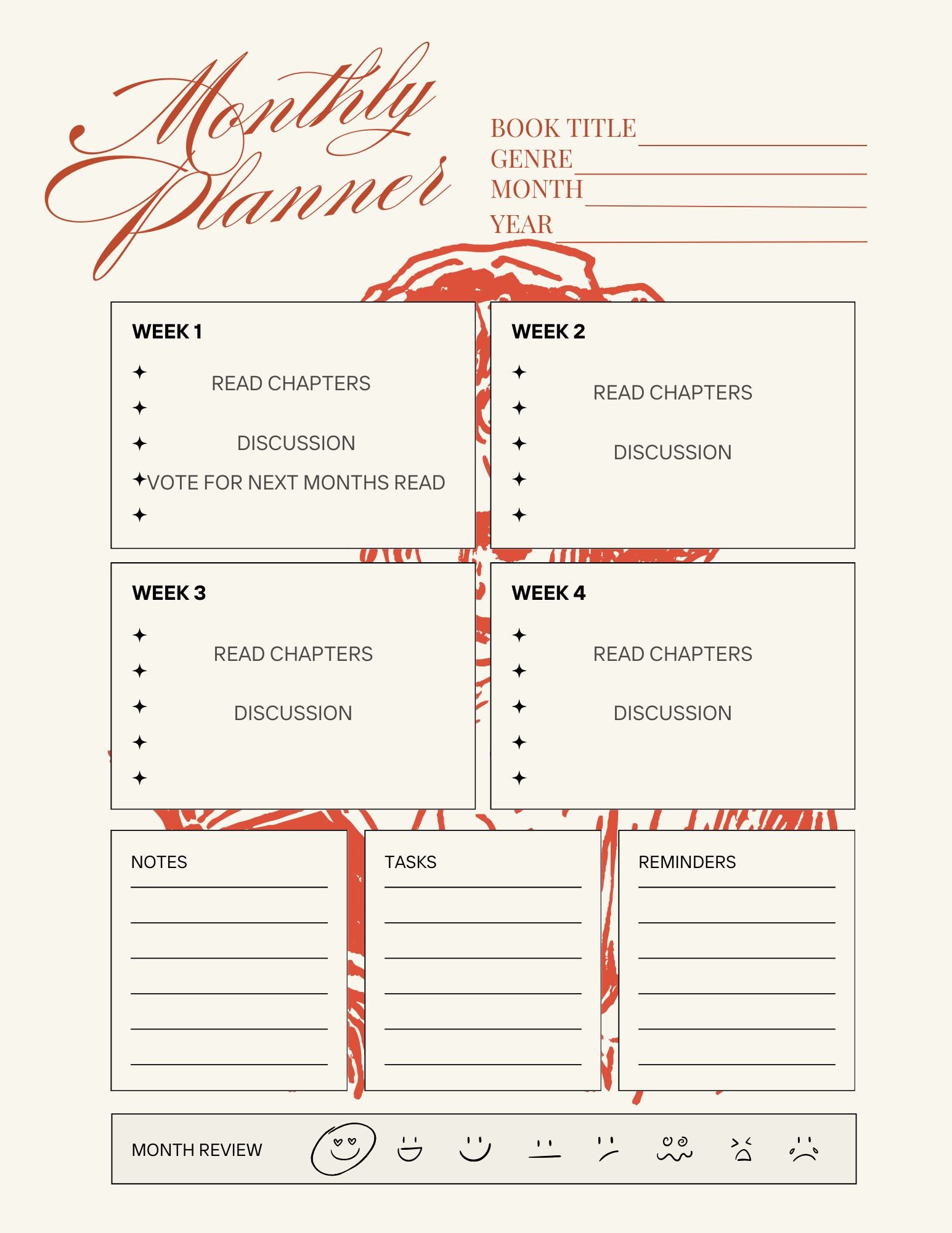 This easy-to-use Book Club Starter Kit is your all-in-one guide to launching a fun, organized, and stress-free book club. Whether it’s with friends, coworkers, or fellow book lovers online, this kit gives you everything you need to host thoughtful discussions and keep your group running smoothly from the very first meeting.