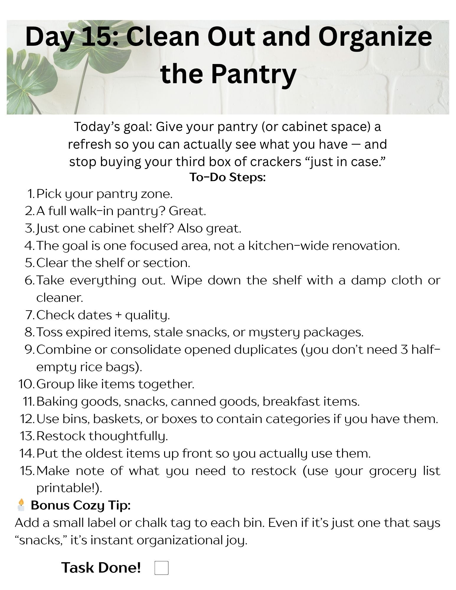 The Cozy Home Challenge is a simple, feel-good plan to get your house in order — without overwhelm. Over 21 days, you’ll tackle daily tasks that bring order to your space and peace to your mind.